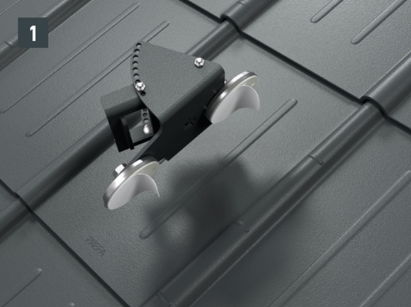 • Zamontuj podstawy na stopniu kominiarskim PREFA, a następnie ściągnij folię ochronną z podstaw (rys. 1).