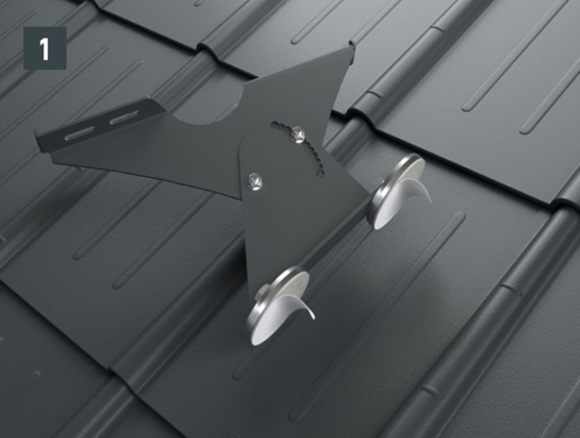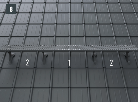 • Zaznaczyć środek krokwi. Odstęp pomiędzy podstawą górną (krawędzią zewnętrzną) a leżącym pod nią rąbkiem powinien wynosić min. 10 mm. Wymagany odstęp pomiędzy obiema podstawami to 84.5 mm (mierzony wewnątrz). W celu przymocowania do krokwi otwory (Ø 8,5 mm) muszą leżeć w osi wspornika bariery śniegowej (przebieg krokwiowy) – wkręty mocujące w jednej osi z krokwiami. Ściągnij folię ochronną ze spodu podstaw, ustaw je i przyklej (rys. 1 + 2).