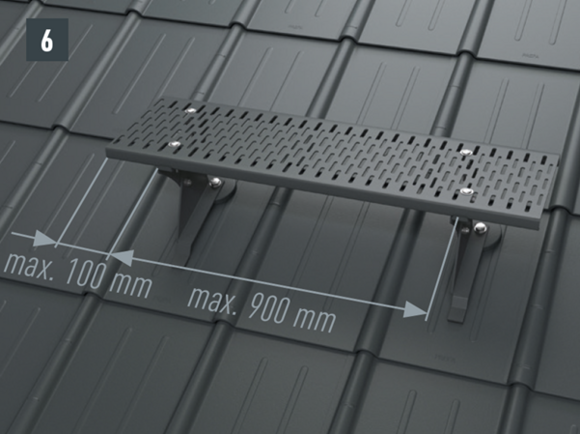 Warunki wstępne to system dachowy PREFA zamontowany zgodnie z obowiązującymi normami/regulacjami branżowymi, na pełnym deskowaniu o grubości min. 24 mm oraz konstrukcja nośna o dostatecznej nośności statycznej. Rozstaw krokwi może wynosić maks. 1000 mm. Wsporniki ławy kominiarskiej należy zamontować na dołączonych podstawach do deskowania.