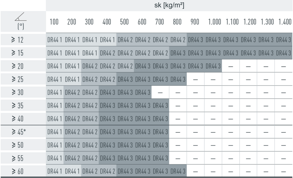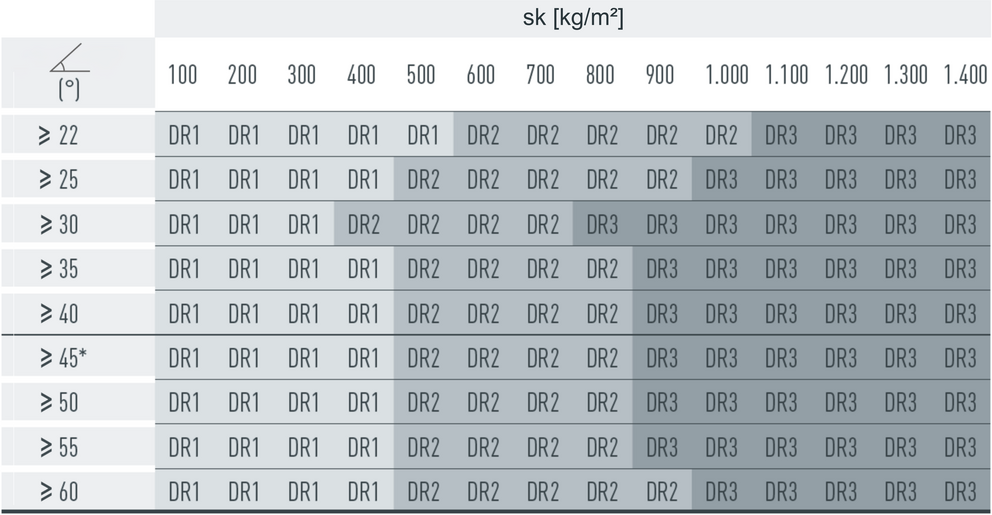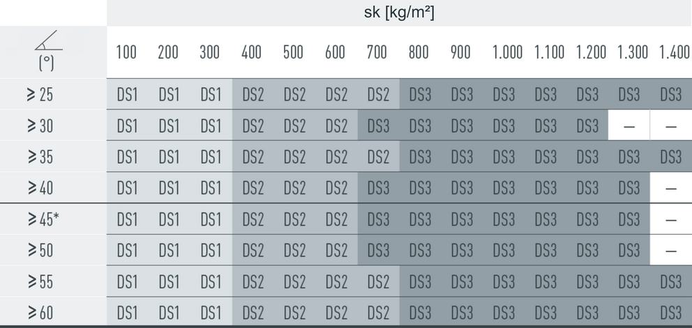 W przypadku dachówki łupkowej montuje się 2,5, 5 lub 10 szt. stoperów śniegowych na m² (patrz tabela poniżej – schemat układania DS1, DS2 i DS3). Pierwsze dwa rzędy muszą zostać na całej długości wyposażone w stopery śniegowe.