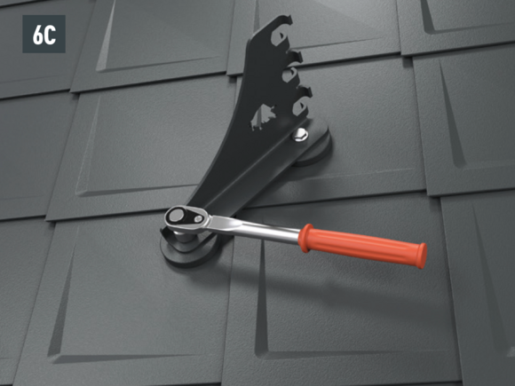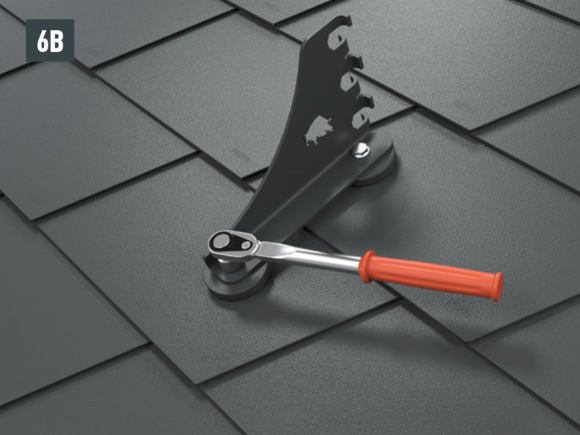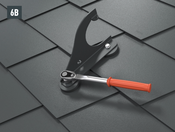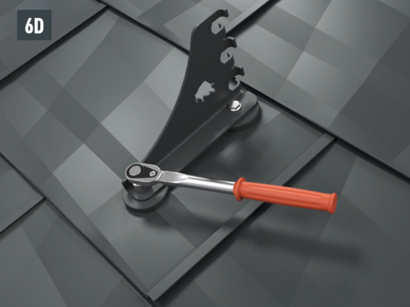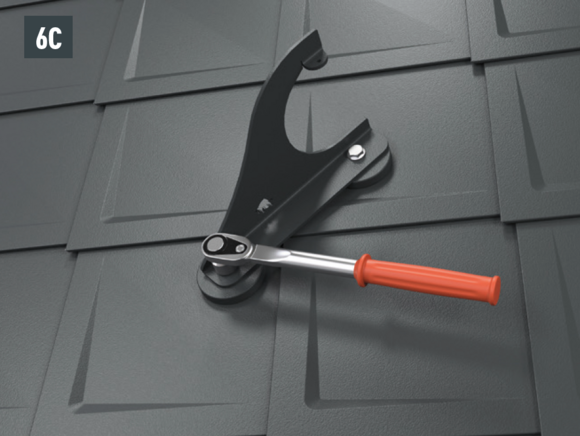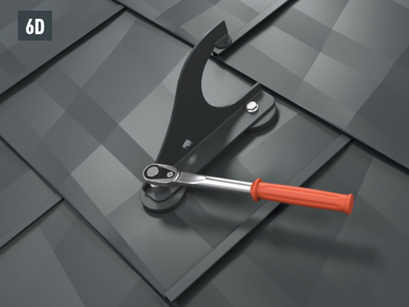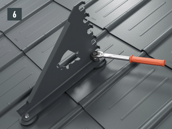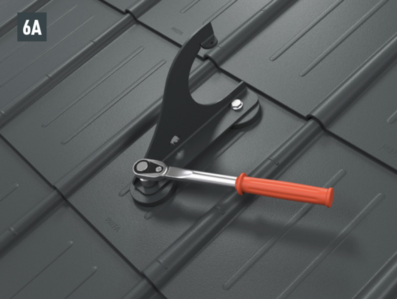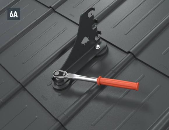 Montaż wsporników bariery śniegowej do warunków górskich za pomocą dwóch śrub z łbem sześciokątnym (M12) na podstawach (rozmiar 19, moment obrotowy: 35 Nm) w przypadku dachówki klasycznej (rys. 6A), dachówki łupkowej (rys. 6B), dachówki romb (rys. 6C), R.16 i FX.12 (rys. 6D).