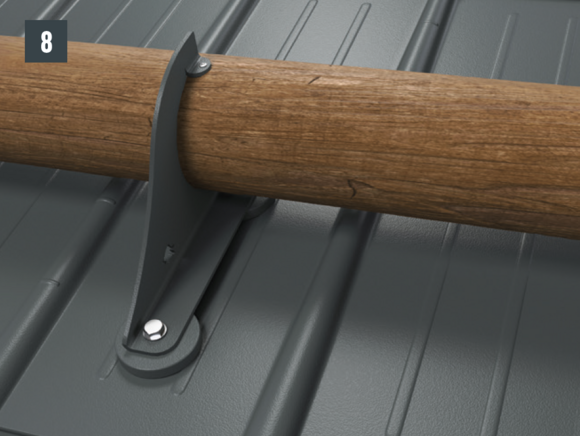 Montaż odbywa się za pomocą dwóch podstaw na pokryciu dachu. Na wspornikach bariery śniegowej do warunków górskich można ułożyć drewniane belki o Ø ok. 140 cm i zamocować je dołączonymi wkrętami. Łączna wysokość wsporników z podstawami: 219 mm. Wsporniki bariery śniegowej do warunków górskich można zamontować także w późniejszym czasie. Jest dostępna we wszystkich kolorach systemów dachowych PREFA (mały format).
