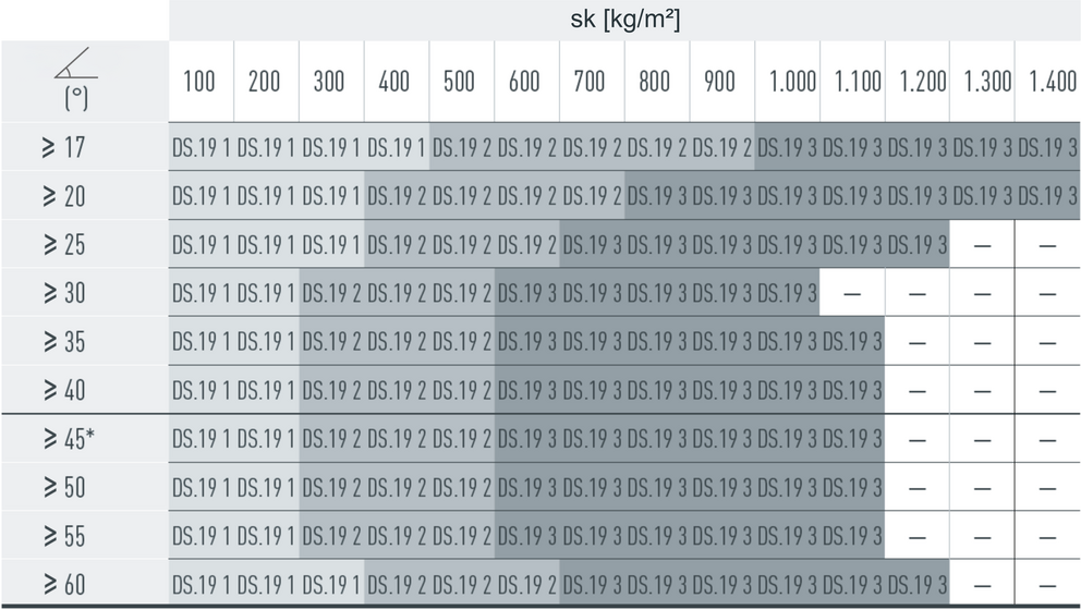 W przypadku dachówki DS.19 montuje się 2, 4 lub 8 szt. stoperów śniegowych na m² (patrz tabela poniżej – schemat układania DS.19 1, DS.19 2 i DS.19 3). Pierwsze dwa rzędy muszą zostać na całej długości wyposażone w stopery śniegowe.