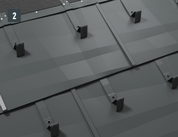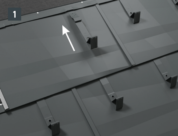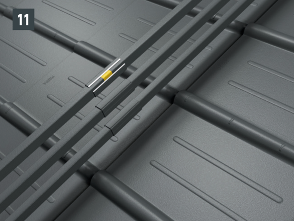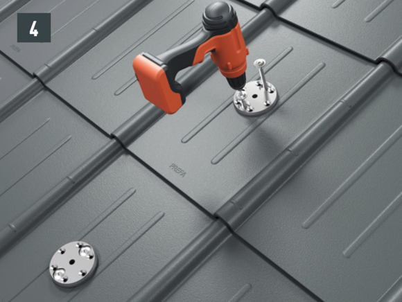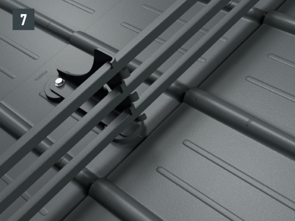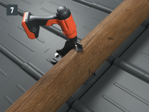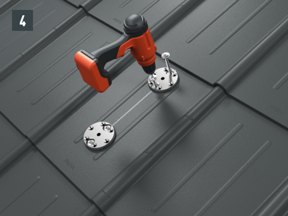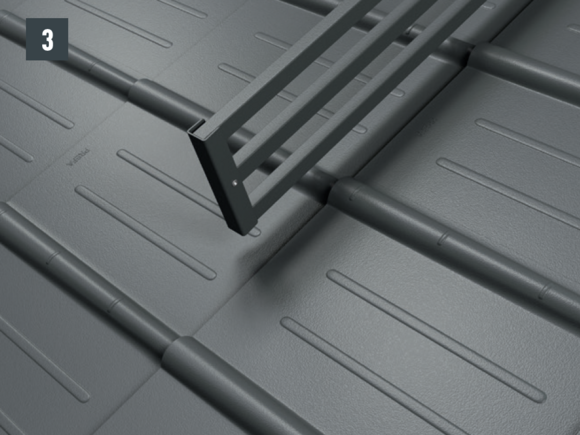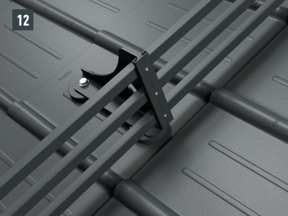 Stopery śniegowe wsuwane są na wysokości wypukłej części rąbka dachówki i mocowane co najmniej 2 gwoździami. W przypadku paneli dachowych FX.12 montaż stoperów śniegowych nie ma wpływu na liczbę zaczepów.