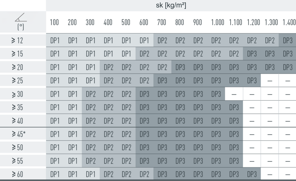 W przypadku dachówek klasycznych montuje się 2, 4 lub 8 stoperów śniegowych na m² (patrz tabela poniżej – schemat układania DP1, DP2 i DP3). Pierwsze dwa rzędy muszą zostać na całej długości wyposażone w stopery śniegowe.