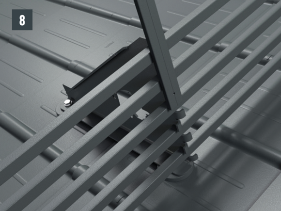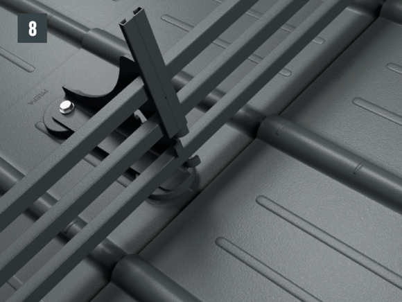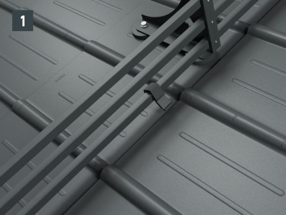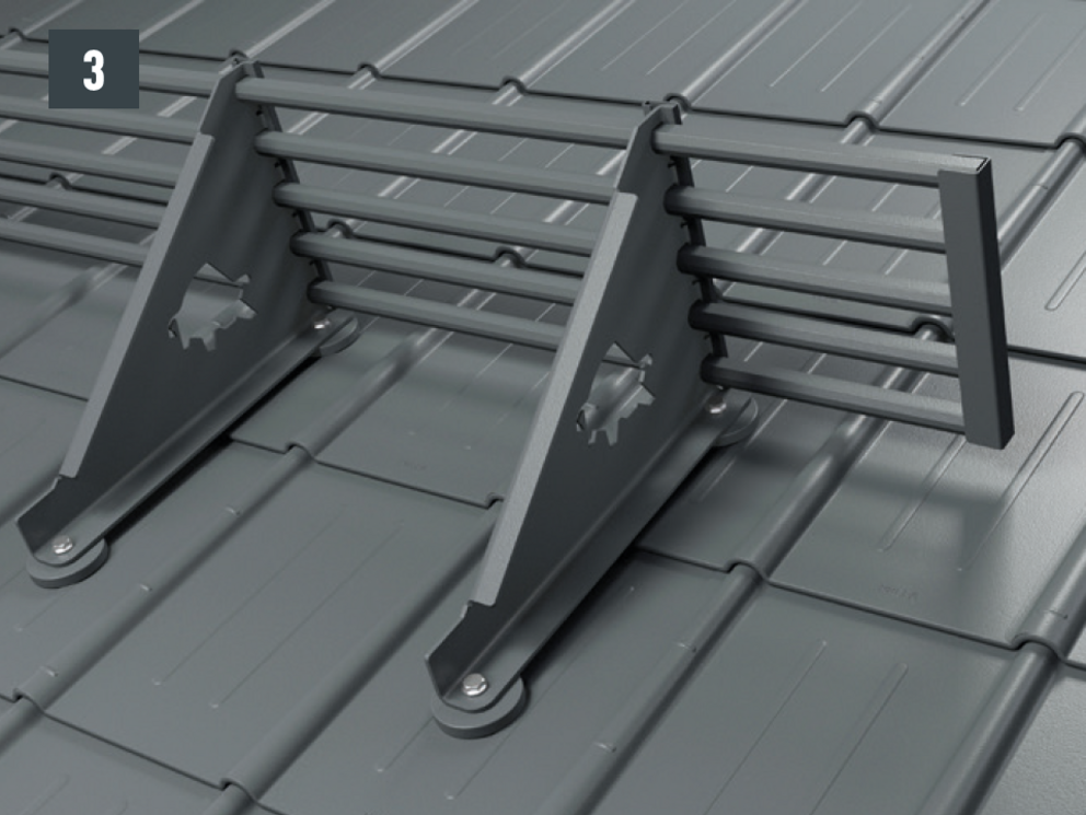 Wsporniki bariery śniegowej są montowane za pomocą dwóch podstaw na pokryciu dachu. Na wspornikach bariery śniegowej układane są rury profilowane, które mocuje się zaciskami. Następnie rury profilowane łączy się ze sobą za pomocą złączek – łączna wysokość razem z podstawami: 219 mm.