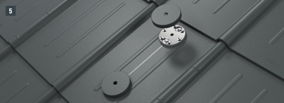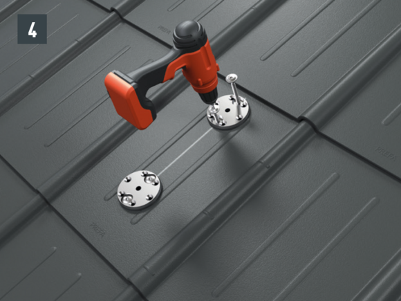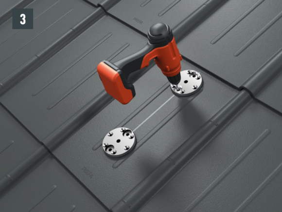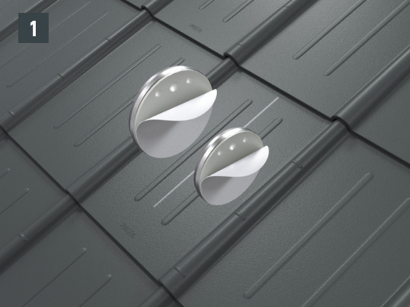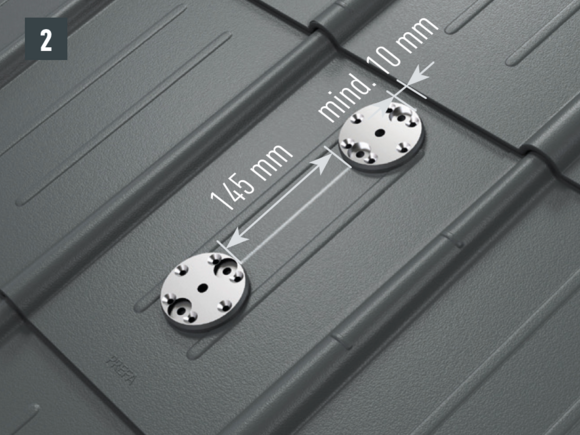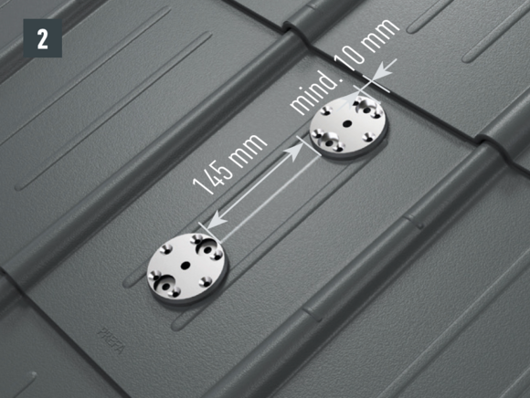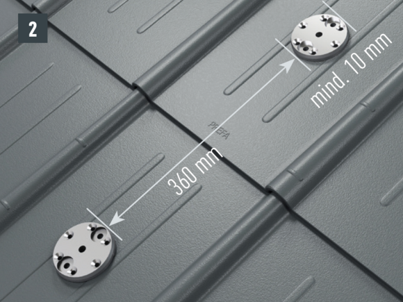 W celu przymocowania do krokwi otwory (Ø 8,5 mm) muszą leżeć w osi wspornika bariery śniegowej (przebieg krokwiowy) – wkręty mocujące w jednej osi z krokwiami. Ściągnij folię ochronną ze spodu podstaw, ustaw je i przyklej (rys. 2).