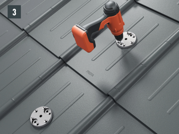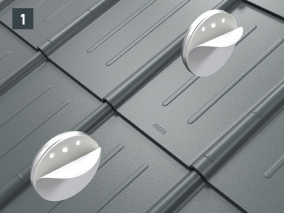 W przypadku wszystkich systemów dachowych PREFA konieczne może być zamontowanie blachy podkładowej (np. jeśli w obszarze krokwi znajduje się rąbek lub grzbiet fali). Nie osadzać podstawy na rąbku ani grzbiecie fali pokrycia dachowego PREFA ani nie mocować jej w tych punktach.