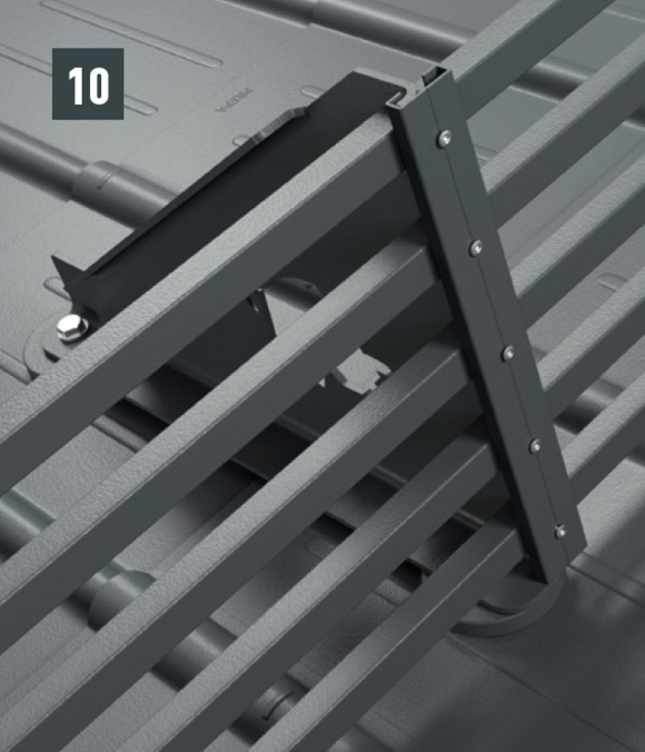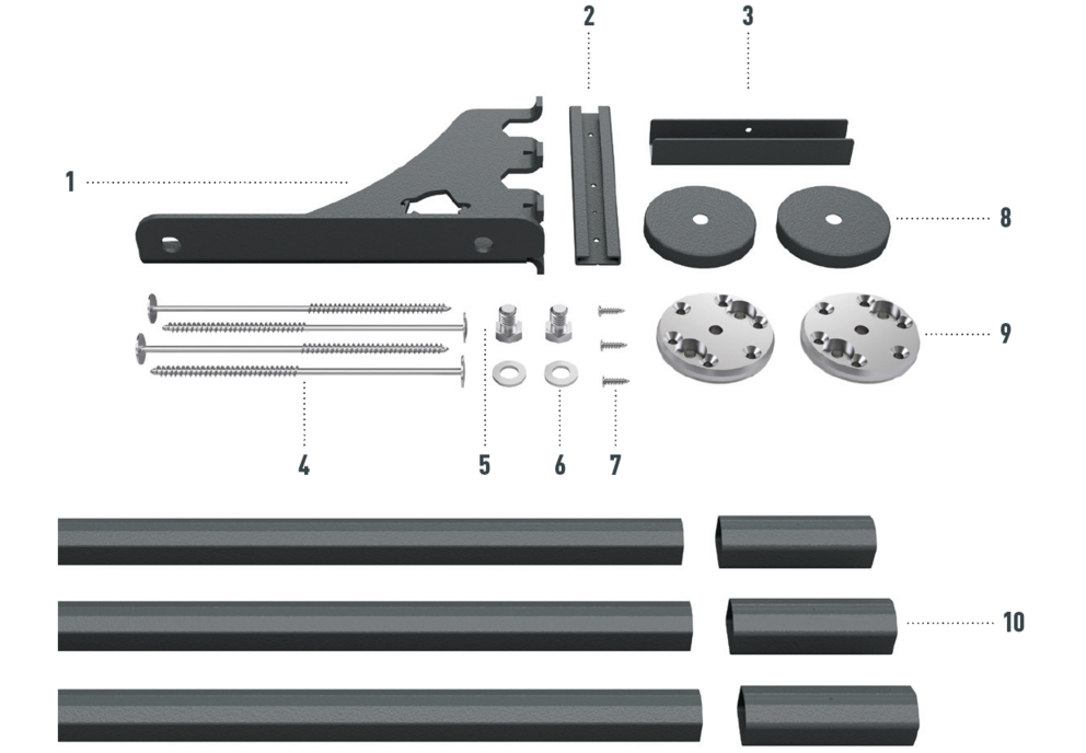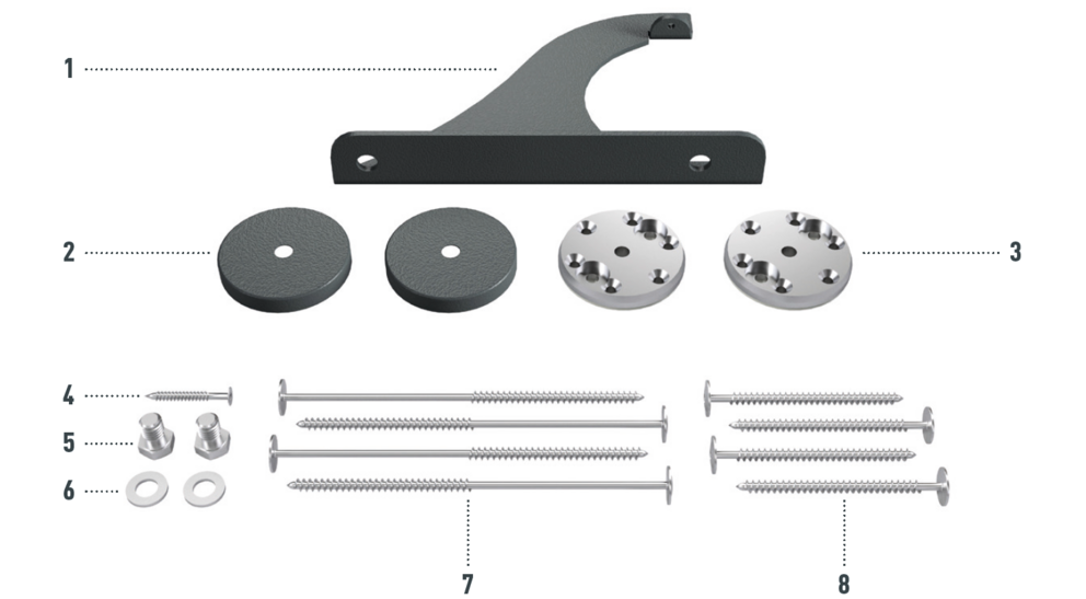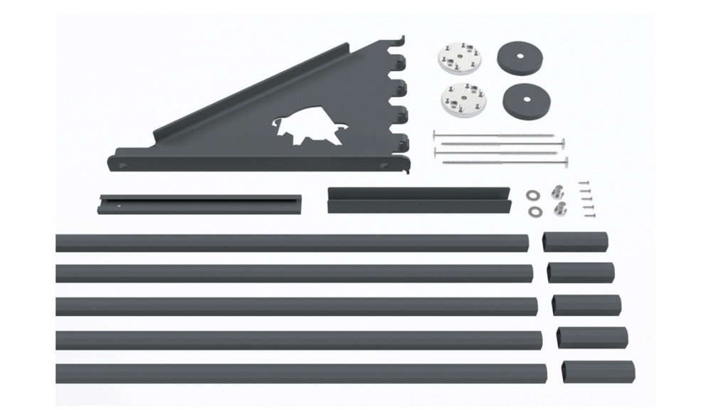 Wykonany z malowanego, bardzo wytrzymałego stopu aluminium, złożony z dwóch podstaw z uszczelnieniem, wspornika bariery śniegowej XL i zacisków, wraz z materiałem mocującym. |