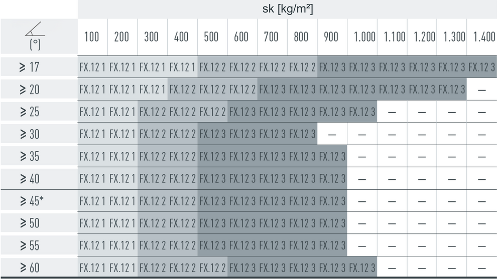 W przypadku paneli dachowych FX.12 montuje się 1,7, 3,4 lub 6,8 szt. stoperów śniegowych na m² (patrz tabela poniżej – schemat układania FX.12 1, FX.12 2 i FX.12 3). Pierwsze dwa rzędy muszą zostać na całej długości wyposażone w stopery śniegowe.