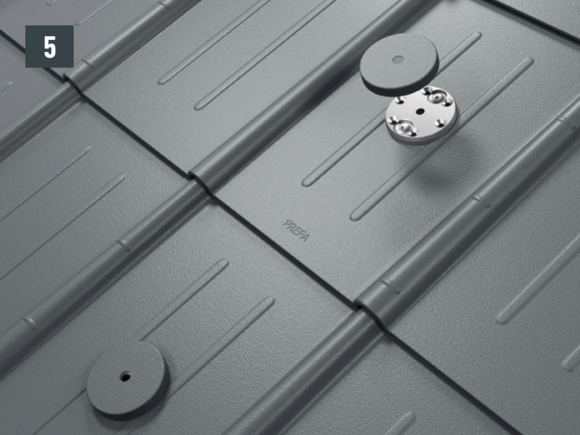 W przypadku wszystkich systemów dachowych PREFA konieczne może być zamontowanie blachy podkładowej (np. jeśli w obszarze krokwi znajduje się rąbek lub grzbiet fali). Nie osadzać podstaw na rąbku ani grzbiecie fali pokrycia dachowego PREFA ani nie mocować ich w tych punktach.