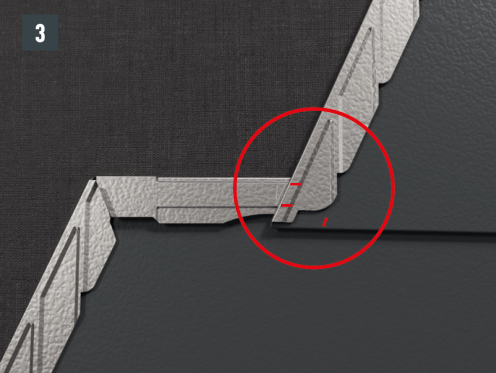 • Dwa oznaczenia na skośnym rąbku dachówki DS.19 wyznaczają dolny i górny koniec przetłoczenia na górnym obrzeżu dachówki DS.19 znajdującej się pod spodem (rys. 3).