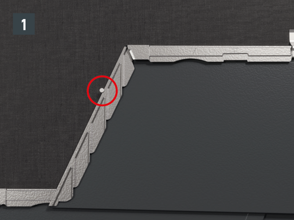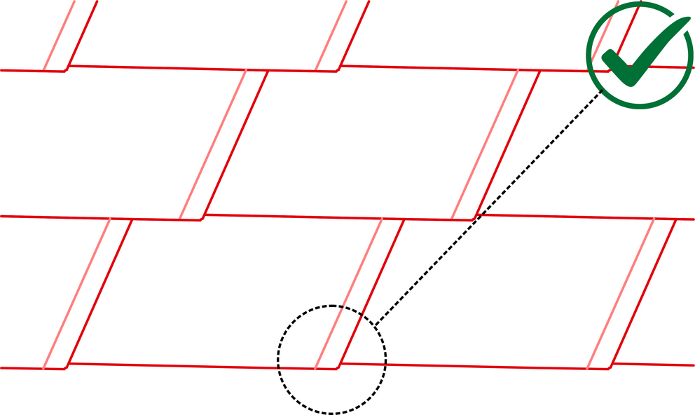 Ze względu na kształt dachówki łupkowej DS.19 w obszarze piętki tworzy się uskok. Należy zachować go także podczas układania pierwszej dachówki DS.19 każdego rzędu, nie wsuwając jej do końca na pas startowy lub w rąbek. Piętkę pierwszej dachówki DS.19 należy obniżyć na tyle, aby górne obrzeże dachówki na całej długości leżało prosto.
