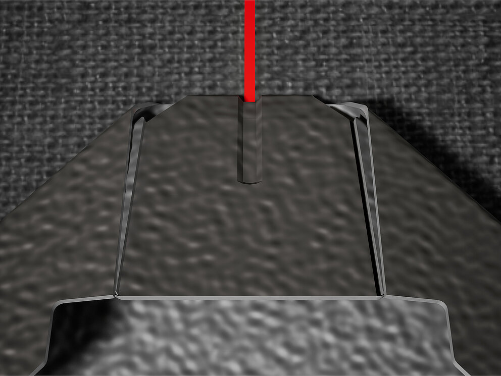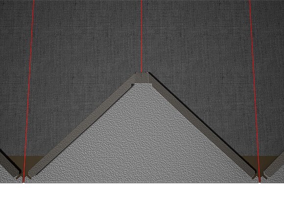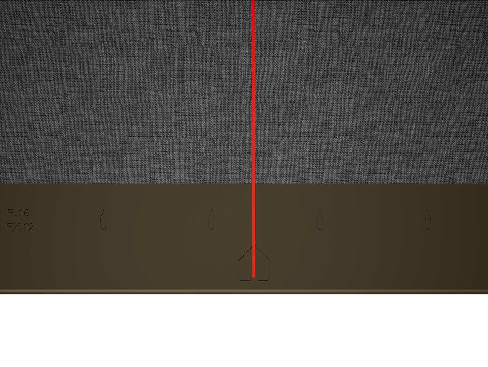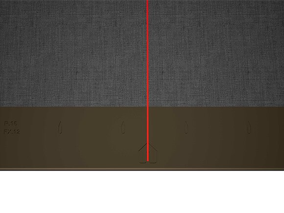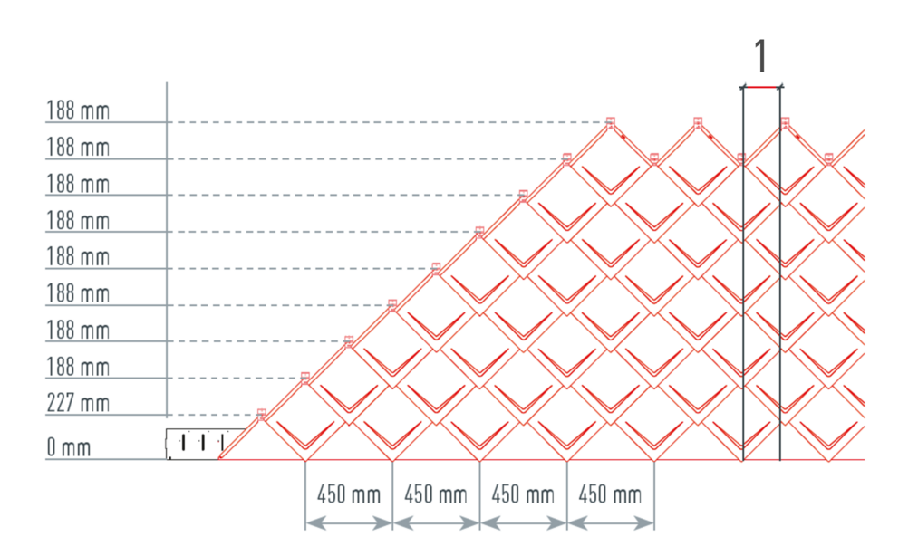 Dla łatwiejszego montażu dachówek romb 29 × 29 PREFA zaleca się naniesienie na połać pionowych linii traserskich w odległości co 450 mm. Aby w każdym rzędzie dokładnie trzymać się tych linii, w razie potrzeby można nanieść także dodatkowe linie pomocnicze w połowie odległości pomiędzy liniami głównymi. Ustawić dachówki początkowe nacięciami (przy górnej krawędzi dachówek początkowych) do prostopadłych linii traserskich (patrz rysunek poniżej). Pamiętaj, że obszar zakończenia bocznego (np. na wykończenie deski szczytowej) nie może leżeć w połowie dachówki romb 29 × 29 (zwracaj uwagę na symetrię/środek połaci).