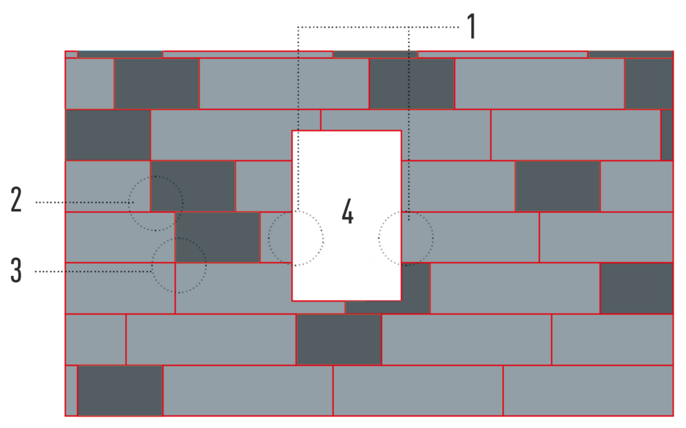Odcięta część panelu FX.12 została wykorzystana po drugiej stronie otworu (4) (1). Zakłóca to poprawny układ styków paneli (2) i w najgorszym razie może prowadzić do zbiegu linii styku (3). Dlatego opracowano przykłady montażu z optymalnym przesunięciem.