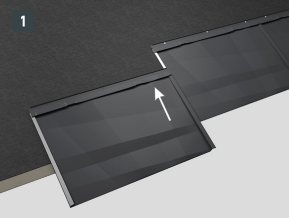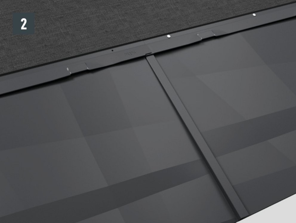 • Przystaw panel dachowy FX.12, po czym wsuń go w rąbki (rys. 1 + 2). Lekko dobij dolną krawędź panelu trzonkiem młotka.