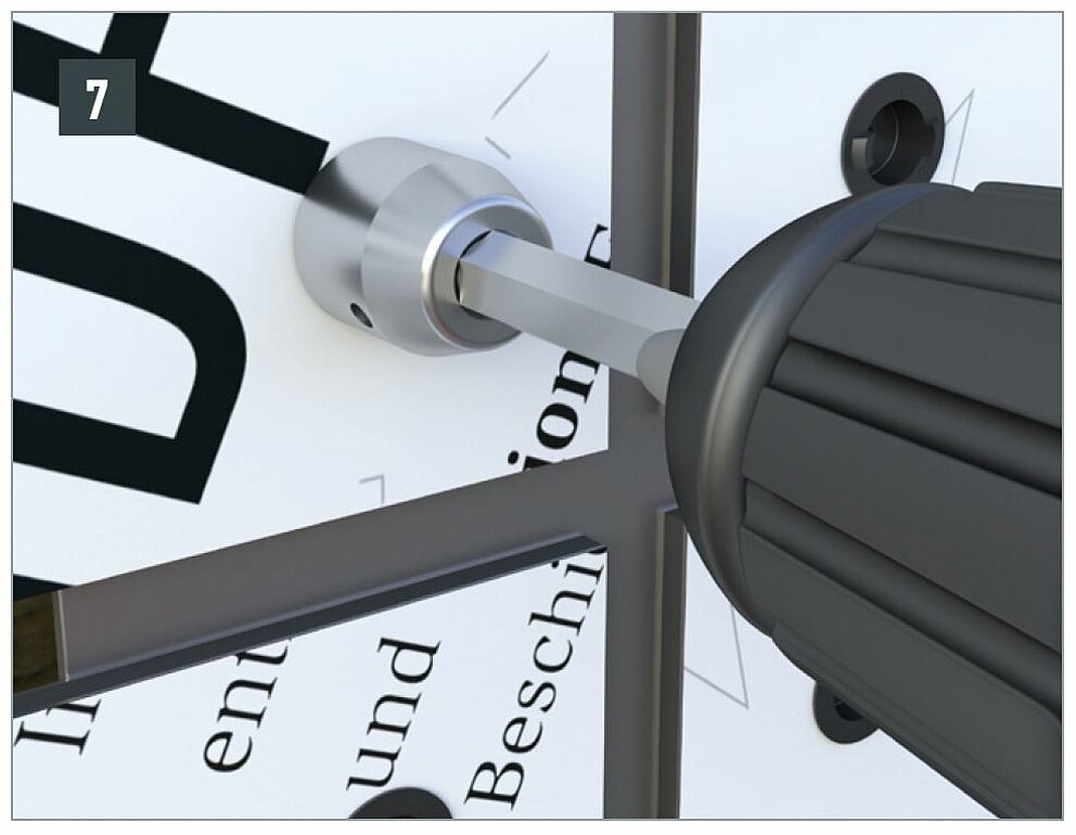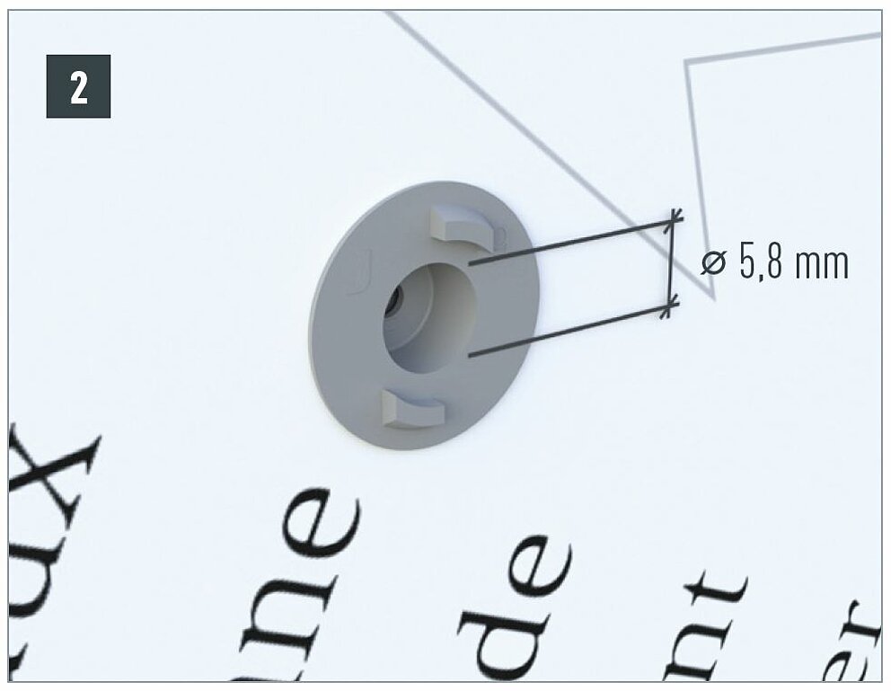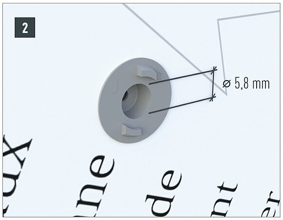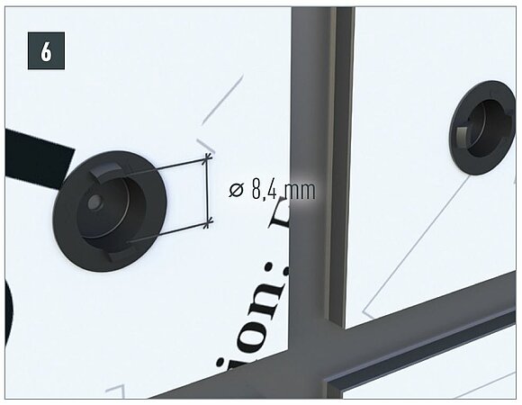 Ponieważ aluminiowa płyta kompozytowa PREFABOND jest w tym punkcie trwale połączona z podkonstrukcją drewnianą, punkt stały zapobiega przesuwaniu się płyty. Aby wykonać punkt stały, wcisnąć do otworu tuleję do punktu stałego ⌀ 8,5 mm na ⌀ 5,1 mm. W kolejnym kroku można wkręcić śrubę.