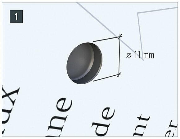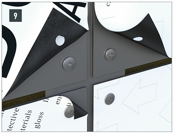 Lekko naciąć folię ochronną wokół wierconego otworu za pomocą noża do folii PREFA (⌀ 9,5 mm), aby po zakończeniu montażu można ją było bez trudu zdjąć. W przeciwnym razie może dojść do zakleszczenia folii między płytą a spodem łba śruby, co utrudni jej usunięcie.