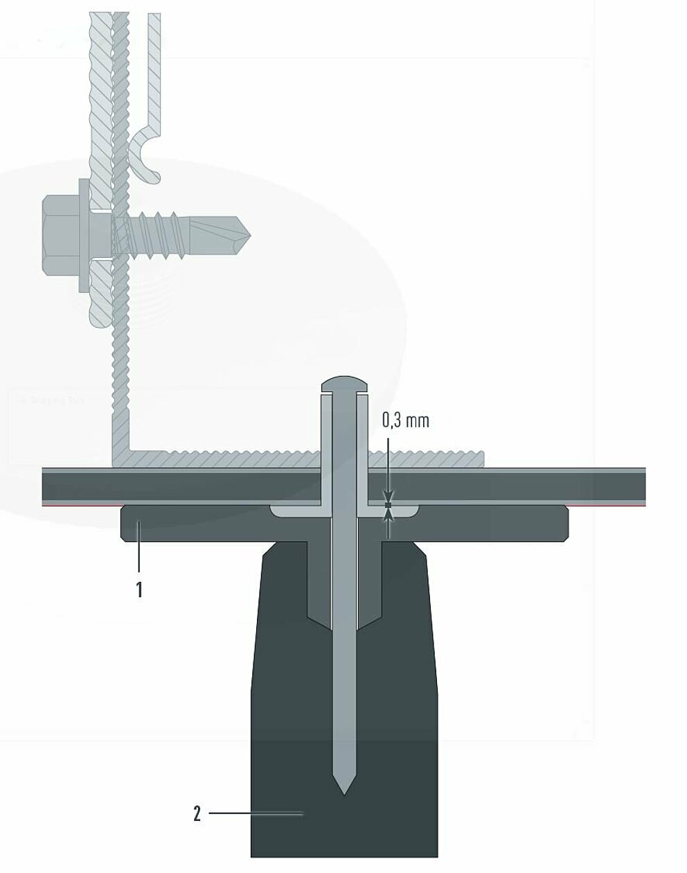 Podczas nitowania, zarówno stałego, jak i przesuwnego, należy zawsze używać odpowiedniego uchwytu do płyty, aby zapobiec odkształceniu powierzchni i zapewnić przesuwność płyty (rozszerzalność materiału).