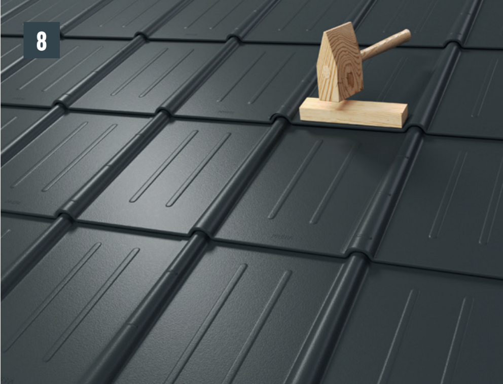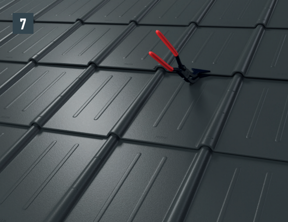 • Ostrożnie ścisnąć ze sobą oba rąbki za pomocą zagiętych cęgów do falcowania. Wpasuj górny rąbek dachówki w pokrycie dachu, pomagając sobie młotkiem i cęgami (rys. 7).