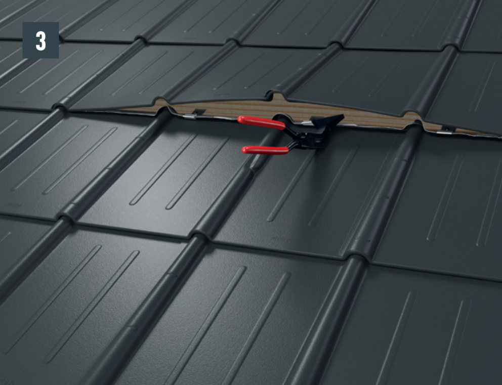 • Cęgami do falcowania otwórz oba zaczepy rąbka i wyciągnąć dachówkę dołem. Nie demontuj zaczepów (rys. 3).