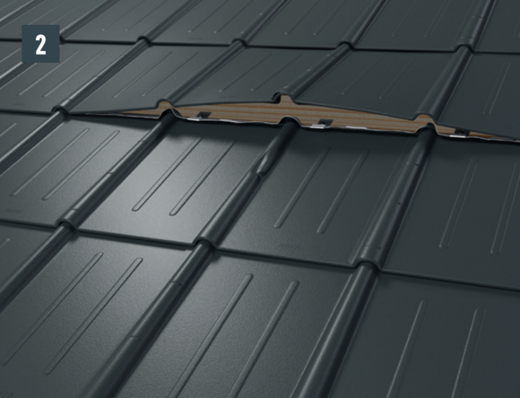 • Przed wsunięciem nowej dachówki przymocować oba żłobki zewnętrzne i otworzyć nieco górny rąbek. Oboma bocznymi żłobkami nowej dachówki można nakryć drugą dachówkę (rys. 5).