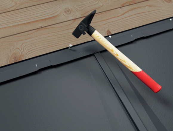 Przystaw dachówkę R.16, po czym wsuń ją w rąbki. Lekko dobij dolną krawędź dachówki trzonkiem młotka.