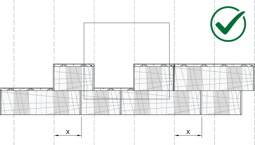 W przypadku układania paneli elewacyjnych FX.12 rąbki kątowe nigdy nie mogą leżeć bezpośrednio jeden pod drugim. Należy zachować przesunięcie boczne wynoszące co najmniej 220 mm. W przypadku mieszania dużych i małych paneli FX.12 w każdym nowym rzędzie styk pierwszego panelu musi zaczynać się w strefie „X”.