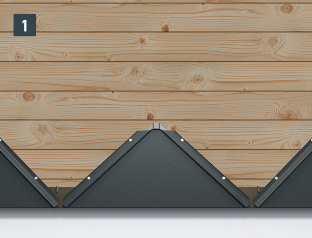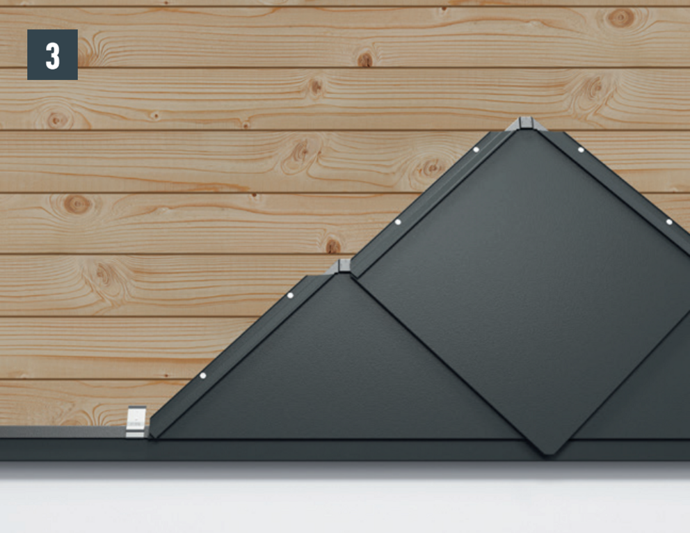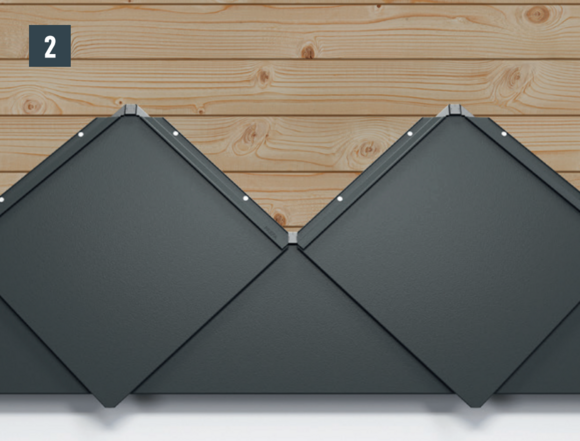Mocowanie każdego rombu elewacyjnego 44 × 44 następuje bezpośrednio z wykorzystaniem wybitych wcześniej otworów mocujących, przy użyciu czterech dołączonych gwoździ 2,8/25.