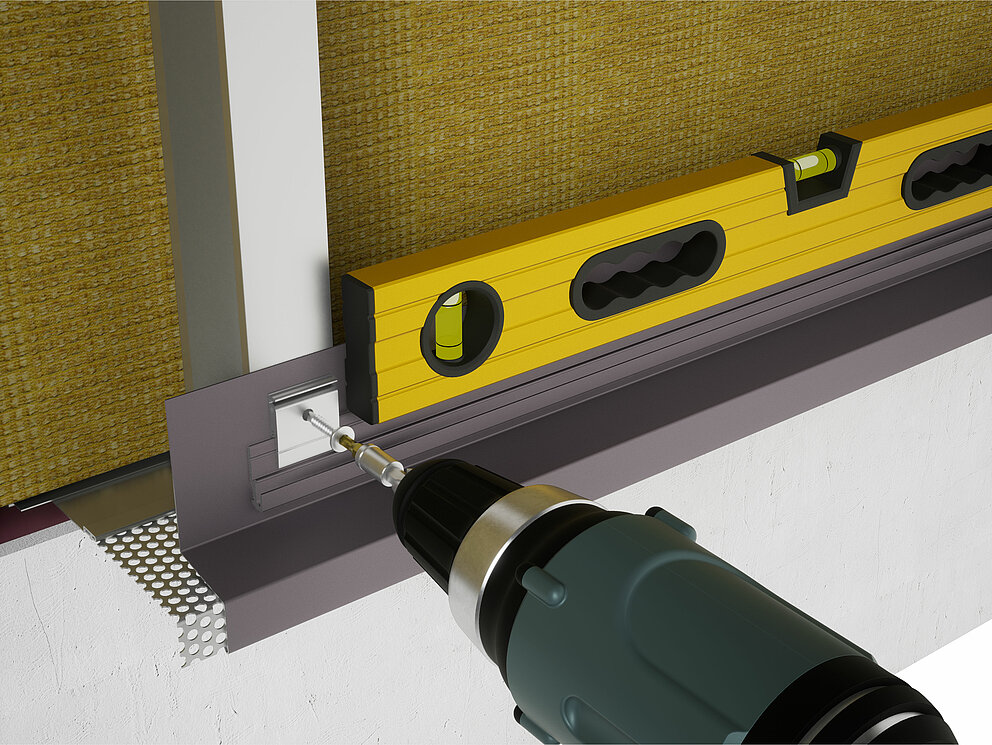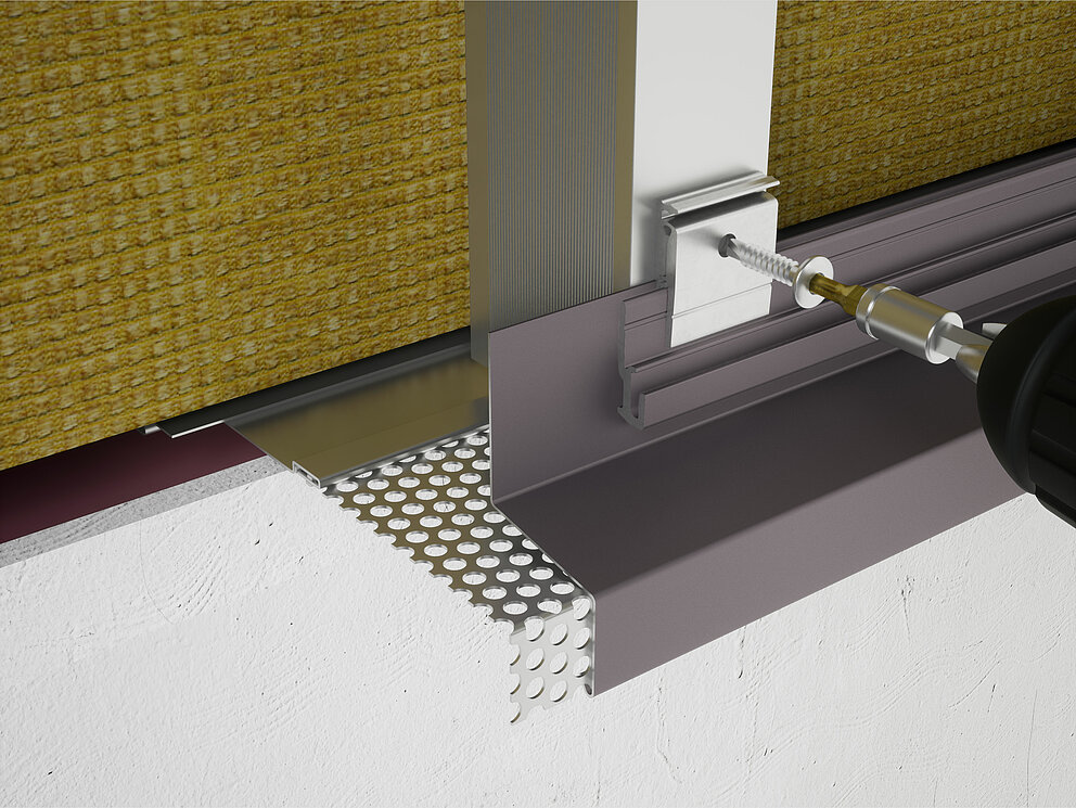 Jeżeli są zamontowane przygotowania przyłączy w obszarze cokołu VHF (blacha perforowana i maskownica), można rozpocząć montaż od profilu początkowego. Profil początkowy jest zawsze pierwszym profilem do wykonania elewacji z profili wytłaczanych.