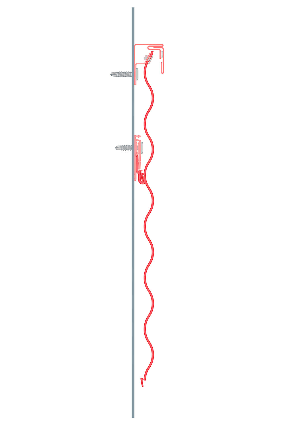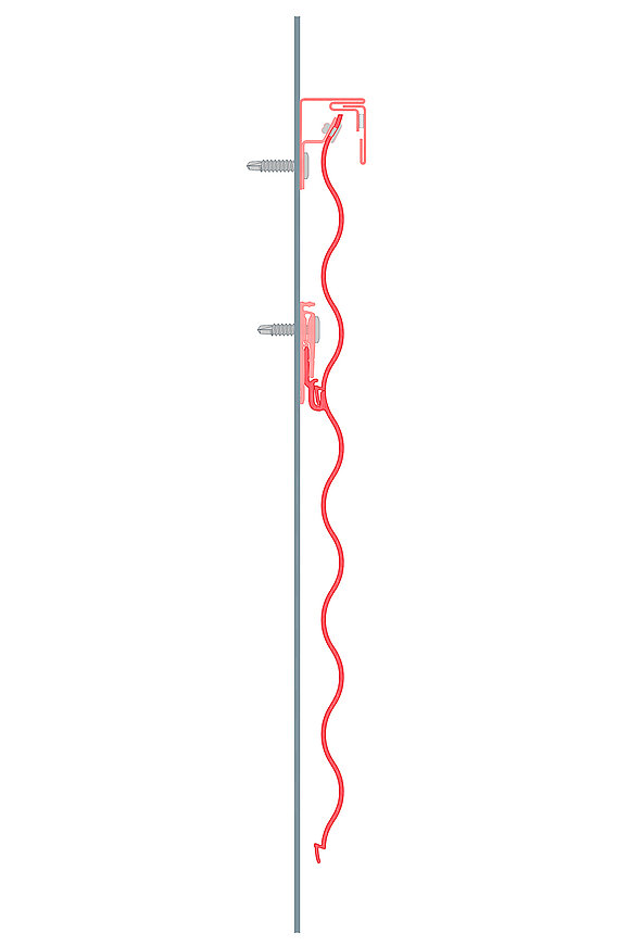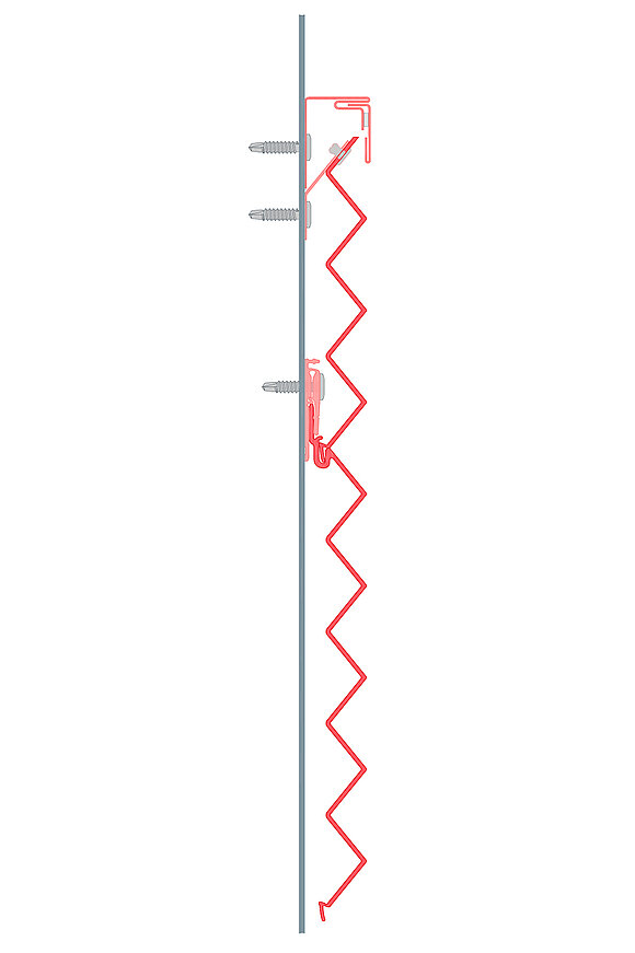 Najpierw zamontować zaczep zwrotny do konstrukcji nośnej, a następnie przymocować skrócony profil do zaczepu zwrotnego za pomocą nitów systemowych PREFA.