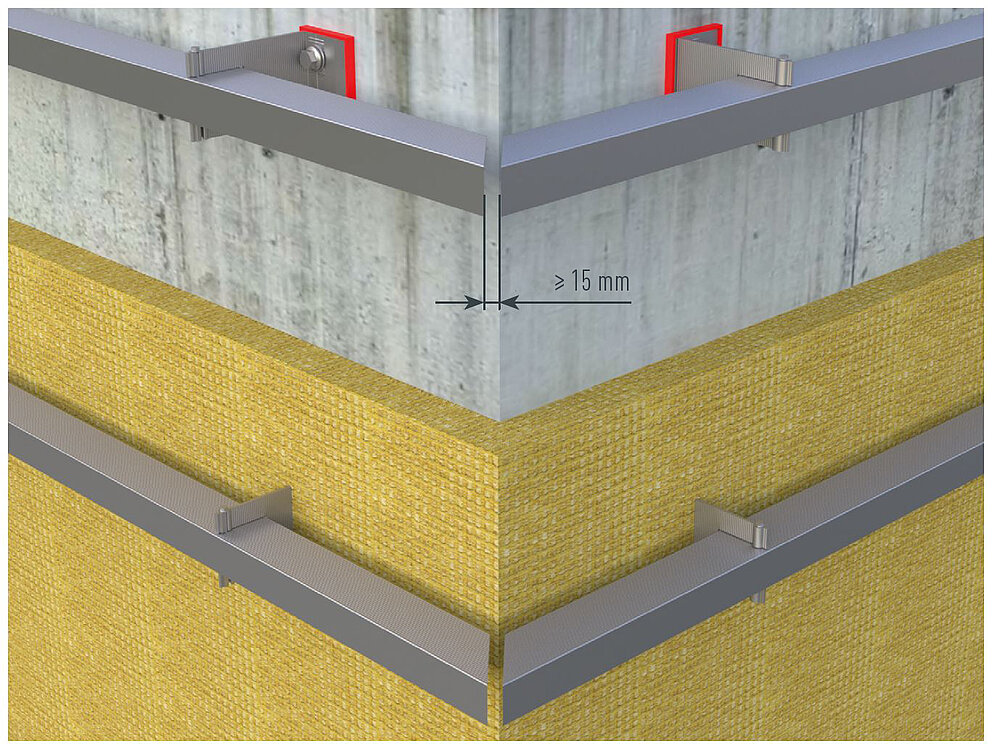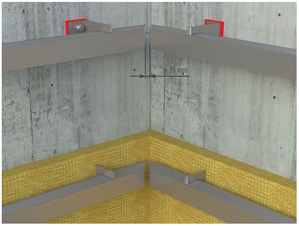Podczas montażu wewnętrznych lub zewnętrznych profili narożnych należy upewnić się, że profile nośne konstrukcji nośnej nie są dociśnięte do siebie w obszarze naroża. Zachować odległość co najmniej 15 mm. Podczas mocowania należy wykonać montaż z uwzględnieniem rozszerzalności z wyraźnym określeniem punktów stałych i przesuwnych.