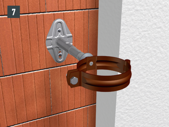 • Obejmę z gwintem M10 przykręcić do elementu mocującego obejmy. Odległość pomiędzy rurą a gotową elewacją musi wynosić co najmniej 20 mm (rys. 7).
