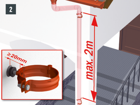 Obejmy należy zamontować tak, aby pomiędzy tylną częścią rury a elewacją zachować min. 20 mm odstępu. Odstęp pomiędzy obejmami nie powinien przekraczać 2 m. (Normy i reguły techniczne obowiązujące w danym kraju mogą dopuszczać większe odstępy. Ze względu na długość rur spustowych PREFA wynoszącą 3 m, odstęp maks. 2 m okazał się praktyczny).