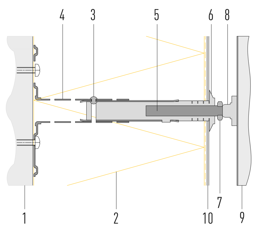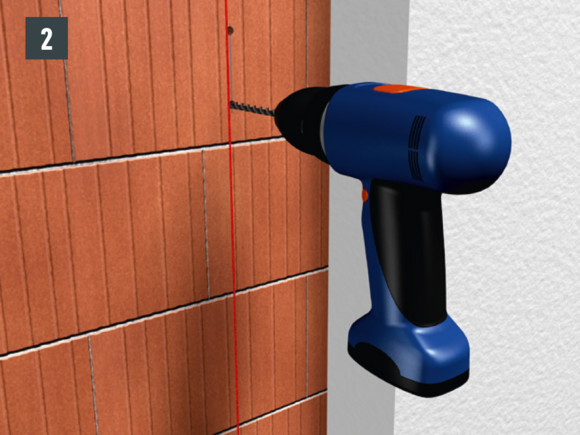 • W zaznaczonych punktach wiertłem o Ø 10 mm nawiercić otwory na głębokość odpowiadającą długości dybli obejm. Minimalna głębokość osadzenia w murze wynosi 70 mm (rys. 2).