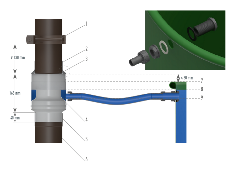 • W rurze spustowej wykonać przerwę o wysokości 165 mm. Krawędź górnej części rury powinna kończyć się ok. 30 mm (lub niżej) powyżej górnej krawędzi zbiornika na deszczówkę. Obejma, która znajduje się powyżej, powinna być oddalona od przerwy w rurze o co najmniej 130 mm.