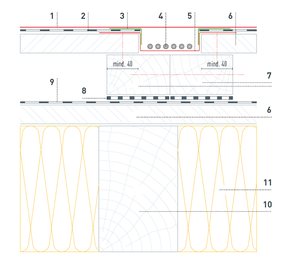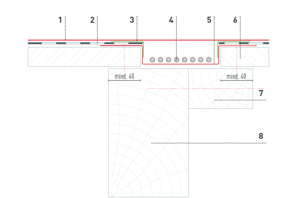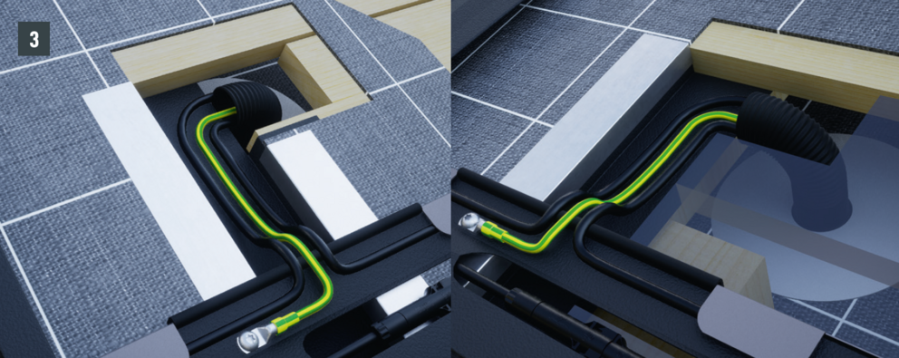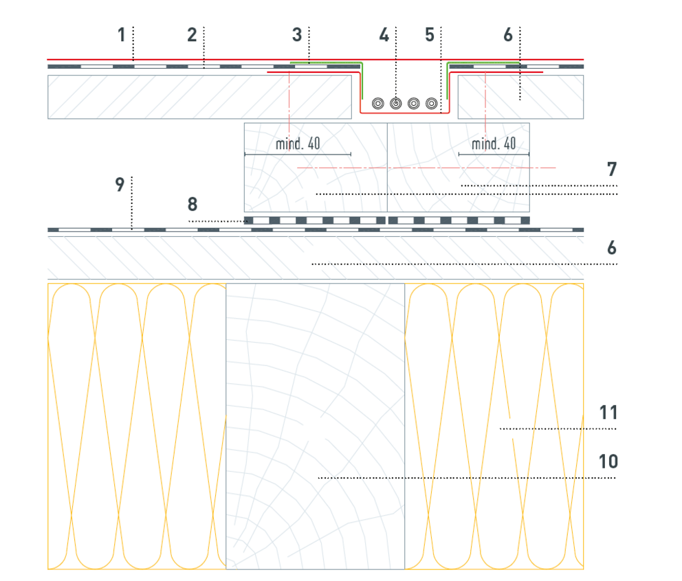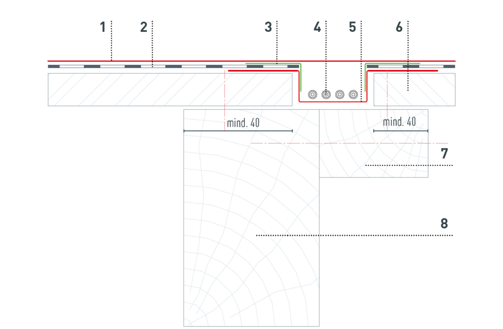 Ze względu na potrzebne prowadzenie przewodów, podkonstrukcję drewnianą należy wykonać zgodnie z poniższymi szczegółami. Liczba i pozycja kanałów kablowych zostaje zdefiniowana przez Technika Produktu PREFA i przedstawiona w planie ułożenia PV.
