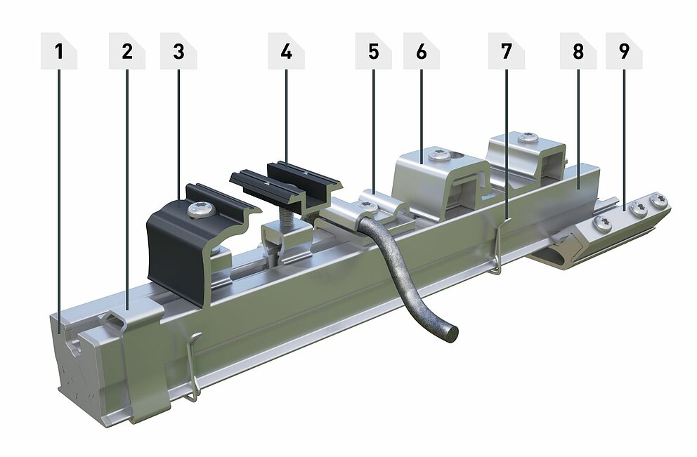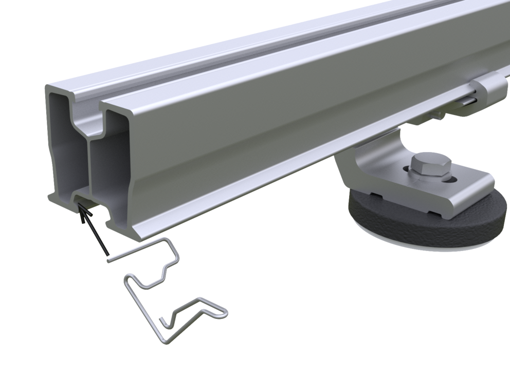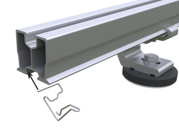 Aby zapobiec spadaniu modułów fotowoltaicznych, w systemie montażowym do instalacji solarnej PREVARIO montuje się śruby zabezpieczające moduł. W najniższym rzędzie modułów na polu generatora zaciska się po dwie śruby zabezpieczające moduł na górnej szynie każdego modułu. W przypadku zsunięcia się modułu, górna krawędź jego ramy zaczepi się o śruby zabezpieczające. Śruby podtrzymujące osuwający się moduł nie zapewniają trwałego mocowania modułu. Należy natychmiast ponownie zamontować moduły, których to dotyczy.