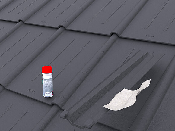 Przeszlifować i oczyścić w miejscu klejenia powierzchnie wspornika i dachówki. Na oszlifowany i oczyszczony wspornik nałożyć klej specjalny. Wspornik wsunąć w górny rąbek dachówki bezpośrednio nad zakładką lub rowkiem środkowym, a następnie opuścić. Popychając go do góry, wsunąć jak najgłębiej w rąbek.