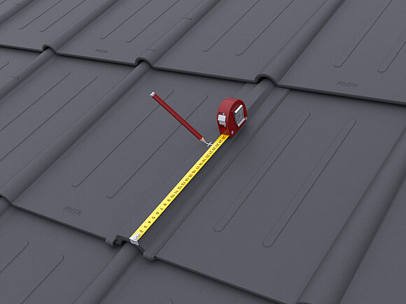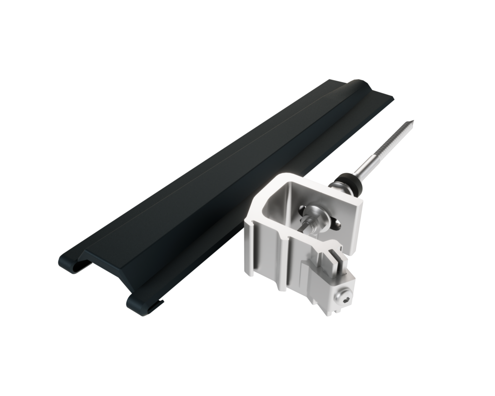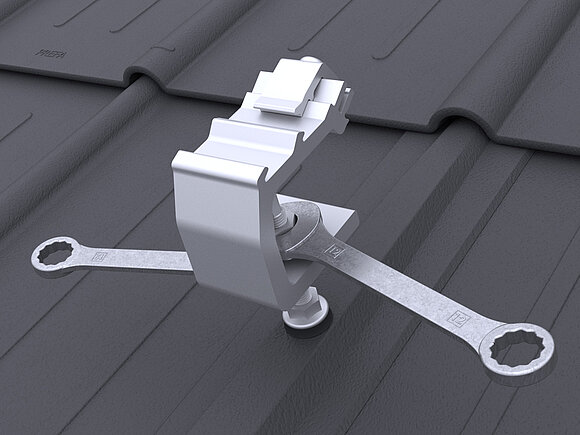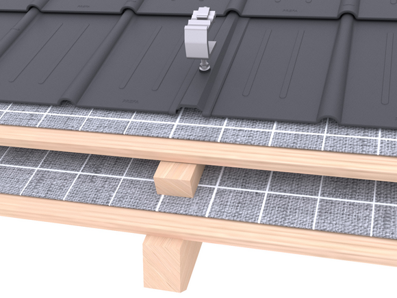 Jeżeli dokładnie nad krokwią (w obszarze montażu śruby dwugwintowej) znajduje się zakładka lub rowek środkowy dachówki, wówczas zamiast blachy podkładowej można zastosować wspornik specjalny panelu słonecznego Sunny.