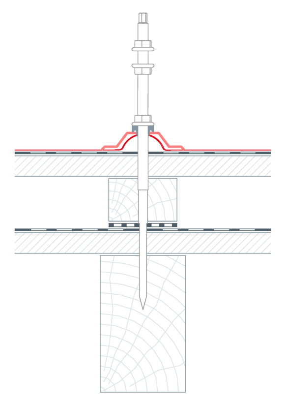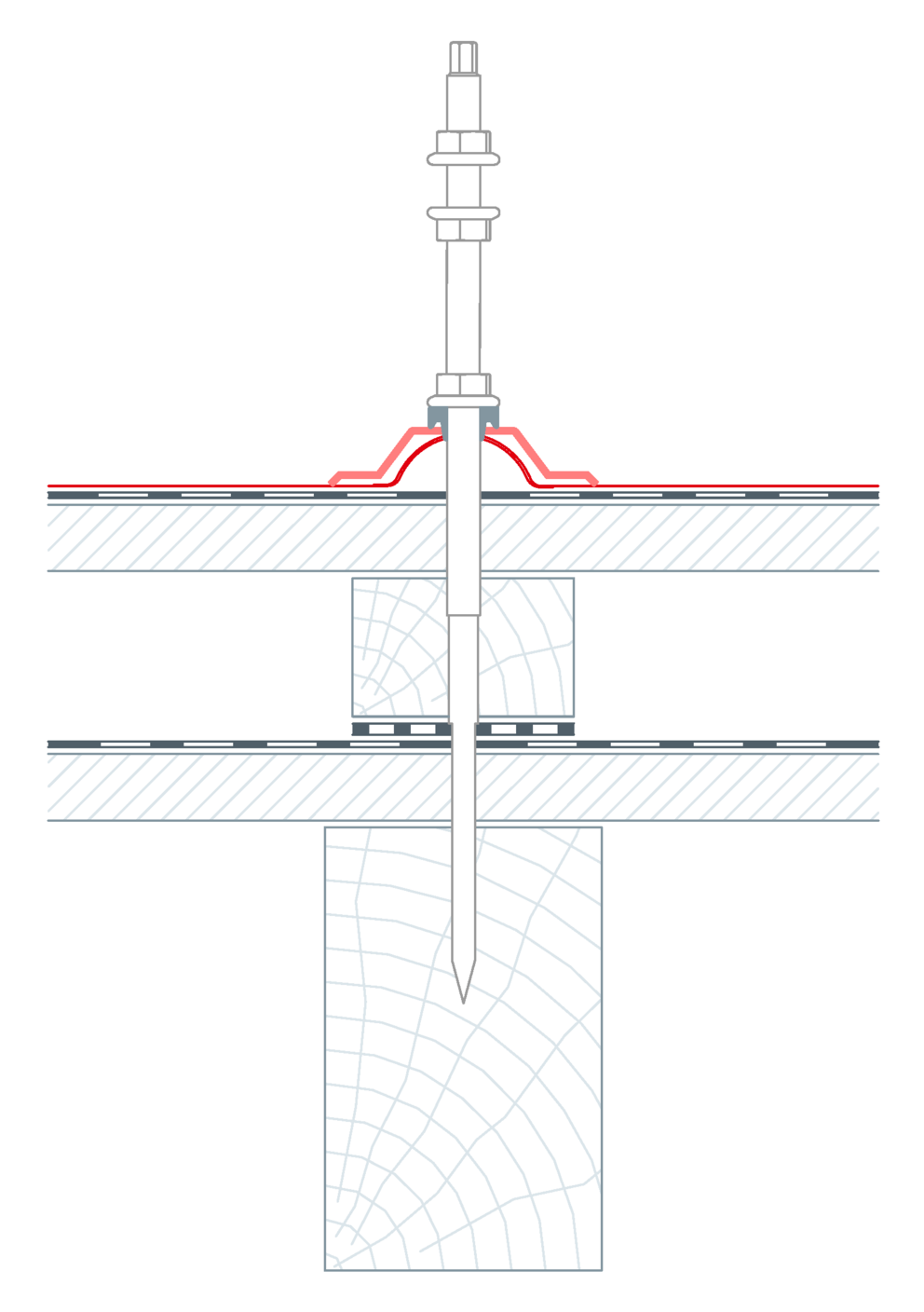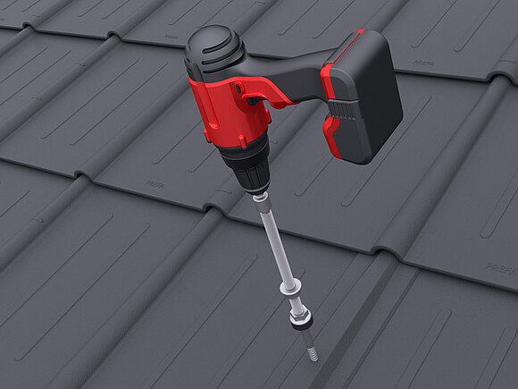 Zaznaczyć położenie śruby dwugwintowej. Konstrukcję drewnianą nawiercać wiertłem o średnicy ⌀ 8 mm. Wykonać otwory w Sunny Spezial i dachówkach wiertłem o średnicy ⌀ 13 mm. Wkręcić śrubę dwugwintową wiertarką (nakładka klucza nasadowego: SW 9). Głębokość wnikania w konstrukcję nośną (krokwie): min. 80 mm.