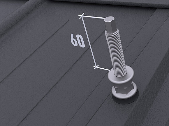 Dokręcić nakrętkę, aż uszczelka EPDM się wybrzuszy (klucz płaski: SW 18). Zamontować drugą nakrętkę i maksymalnie dokręcić. Od górnej krawędzi drugiej nakrętki (oparcie uchwytu szynowy) odmierzyć 60 mm w górę na śrubie dwugwintowej i odciąć. Założyć uchwyt szynowy i na odpowiedniej wysokości (zgodnie z pozostałymi wspornikami solarnymi) dokręcić dwoma kluczami płaskimi (klucz płaski: SW 18).