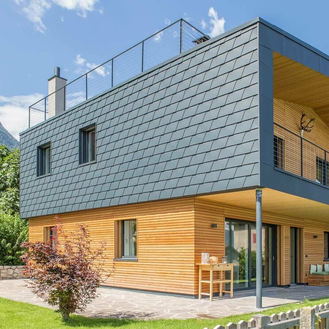 Zastosuj łupki elewacyjne jako atrakcję optyczną, eksponując części elewacji, albo użyj aluminiowych łupków elewacyjnych jako kompletnej okładziny elewacji do budynku. Stwórz nową ścianę zewnętrzną całkowicie według indywidualnych potrzeb i wybierz któryś z licznych kolorów elewacji.